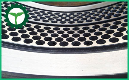 磨損原因很多,分為正常磨損、不正常磨損。正常磨損原因主要有物料的配方、粉碎粒度、粉料的調質質量等。正常磨損情況下環模出現軸向均勻磨損,導致環模模孔變大,壁厚變薄。不正常磨損主要原因:壓輥調得太緊,與環模間隙小,互相磨損;撒料器角度不好,導致分配物料不均勻而部分先磨損;模內掉進金屬而磨損。這種情況下,環模多出現不規則磨損,多為腰鼓形。